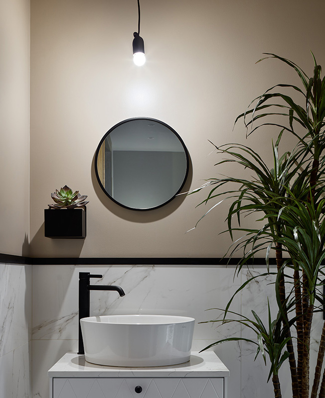 Гостевой санузел. Раковина Superfront. Смеситель Zucchetti. Полка Ferm Living. Зеркало: студия Stameska.