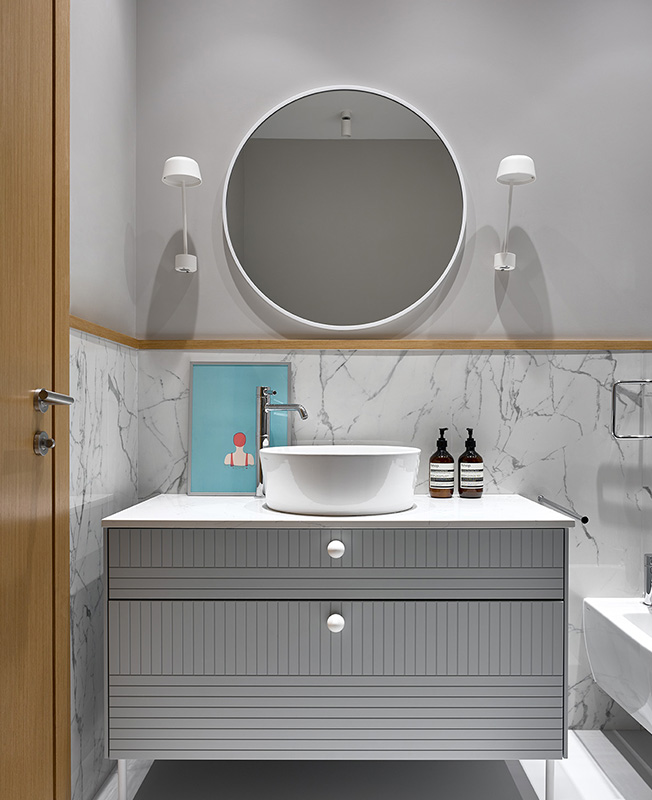 Главная ванная. Смеситель Zucchetti. Бра Muuto. Тумба под раковину изготовлена по эскизам архитектора. Зеркало: студия Stameska. Постер: Note Design Studio.