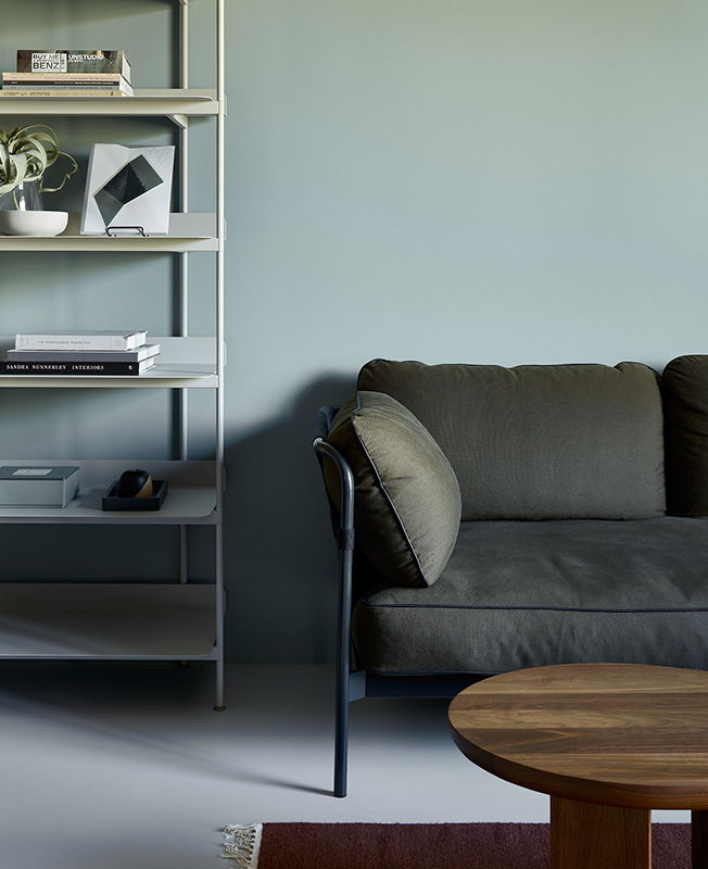 Гостиная. Стеллаж Muuto. Скамья-столик Kim, диз. Лука Никетто для португальского бренда De La Espada. Ковры и подушки Ferm Living. Растения Treez Collection.