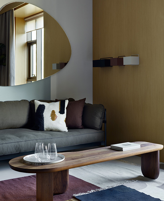 Гостиная. Двухцветная асимметричная покраска стен вместе с изготовленным на заказ зеркалом создают эффектную композицию. Диван Hay. Столик-скамья, диз. Лука Никетто для De La Espada