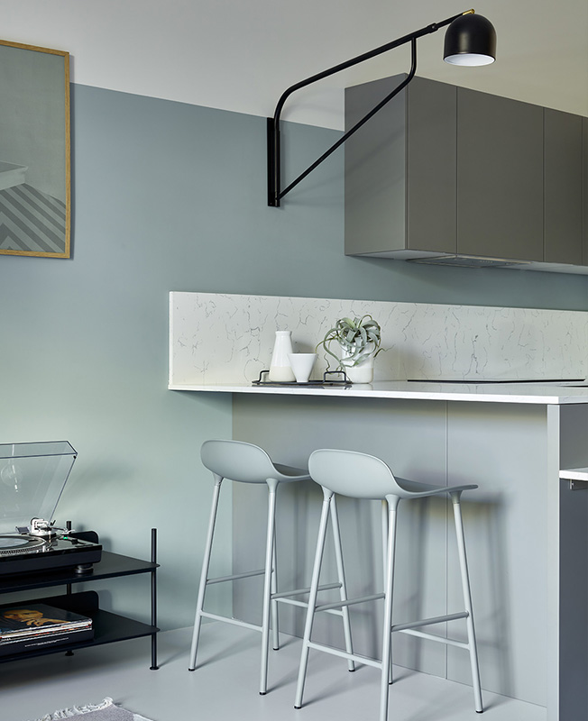 Двухцветная покраска стен создает оригинальный геометричный декор. Стулья Odger — экологичный продукт Ikea и датской дизайн-студии Form Us With Love, изготовлен из утилизованного пластика.