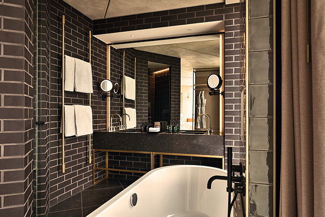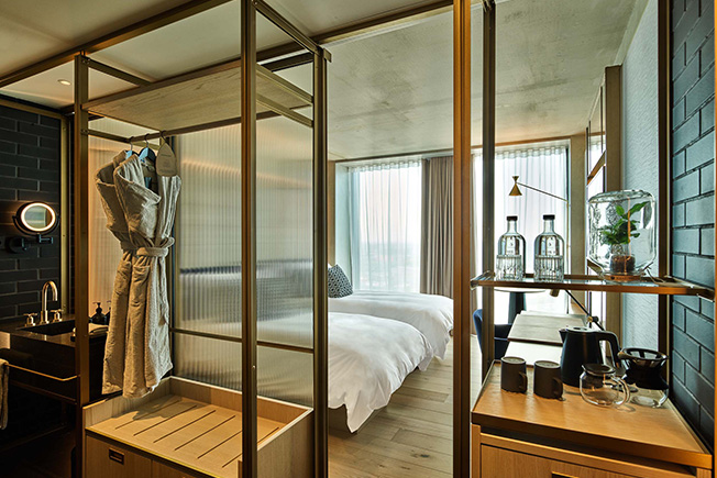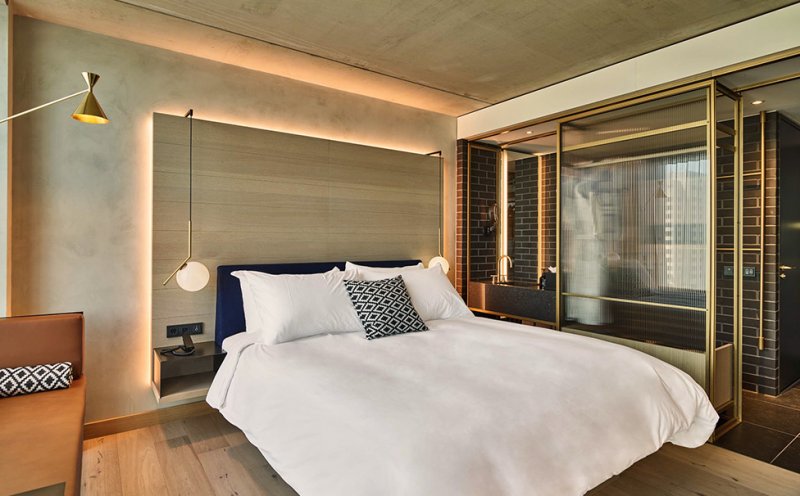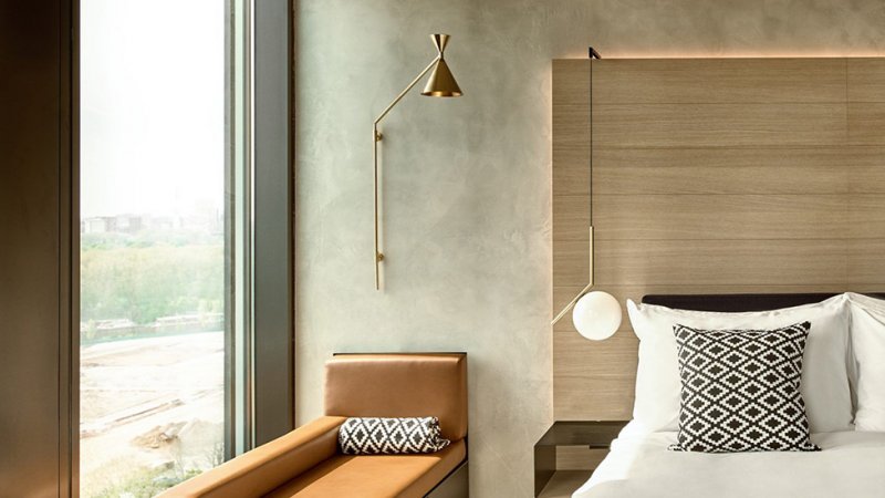 В номерах лондонская фирма Conran & Partners соединила открытые бетонные потолки и темный кирпич (в ванных) с выполненной на заказ мебелью в теплой землистой палитре из таких материалов, как латунь, дуб и кожа. Стеклянные окна от пола до потолка обрамляют панорамные виды на окраины города. И хотя месторасположению QO не хватает очарования исторического центра Амстердама, станция метро здесь — через дорогу, добраться на Центральный вокзал можно всего за десять минут.