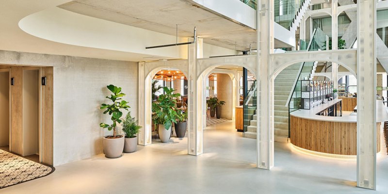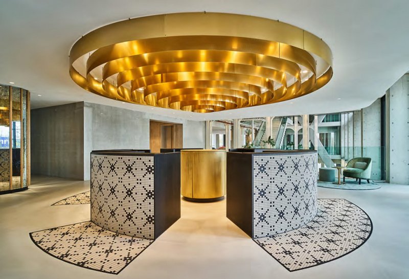 Первое впечатление поражает воображение из-за лобби с трехуровневыми потолками, подвесной лестницей и удлиненным овальным баром. За ним скрывается ресторан Persijn, который отражает принципы шеф-повара Александра Брауэра и современное развитие голландской кухни. В пыльно-зеленом с золотом интерьере ресторана присутствуют такие детали, как мозаика из крошечных черно-белых плиток, вдохновленная национальной вышивкой.