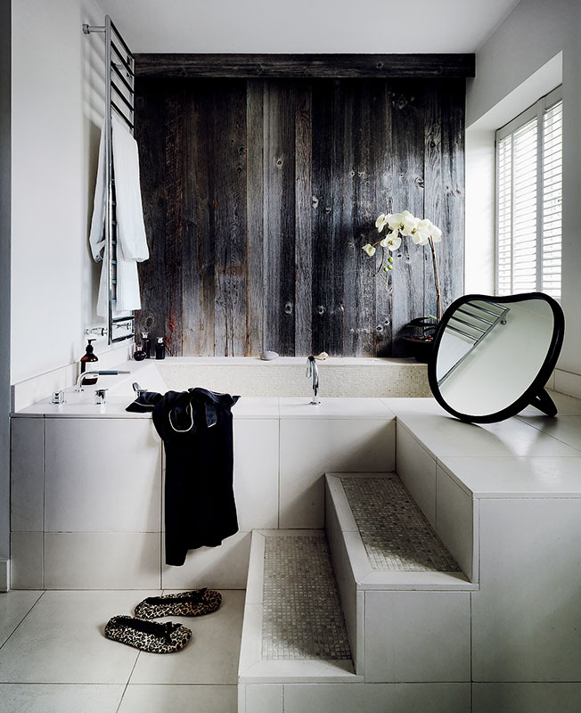Ванная. Над ванной Jacuzzi — панно из старых досок, привезенных из Швеции. Зеркало 1940-х куплено в Париже.