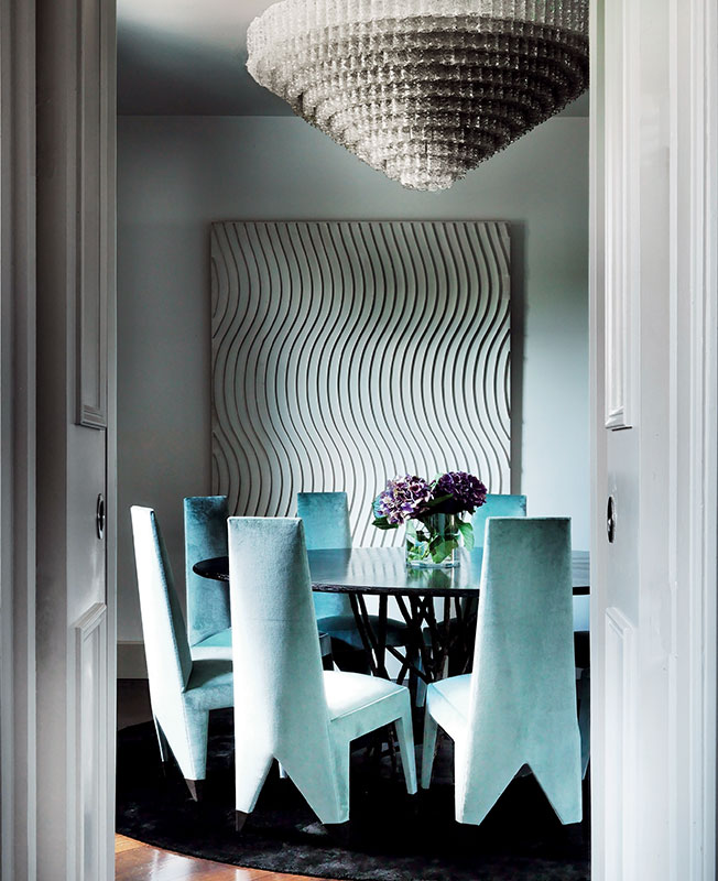 Столовая. Стулья Ф. Ллойда Райта 1930-х гг. в бархате Laduree окружают стол Twig британца Н. Аллена. На стене — работа Wave, М. Кавелл. Роскошная люстра Doria 1960-х была найдена во Франкфурте.