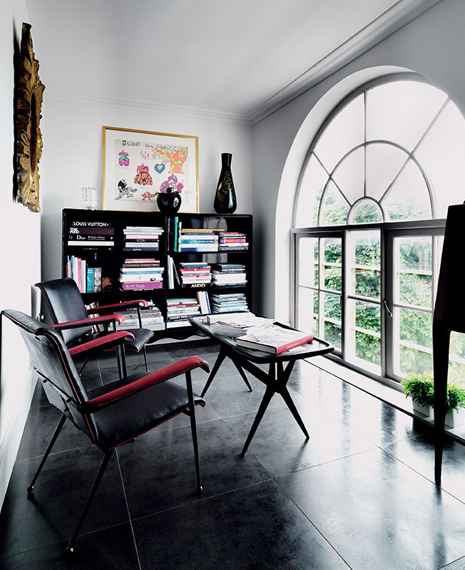 Библиотека с видом на сад. Винтажные стулья французского мастера Ж. Адне, 1950-е. Стол итальянца Дж. Понти. Книжные полки 1950-х куплены в Париже. На них работа Н. де Сен-Фалль.