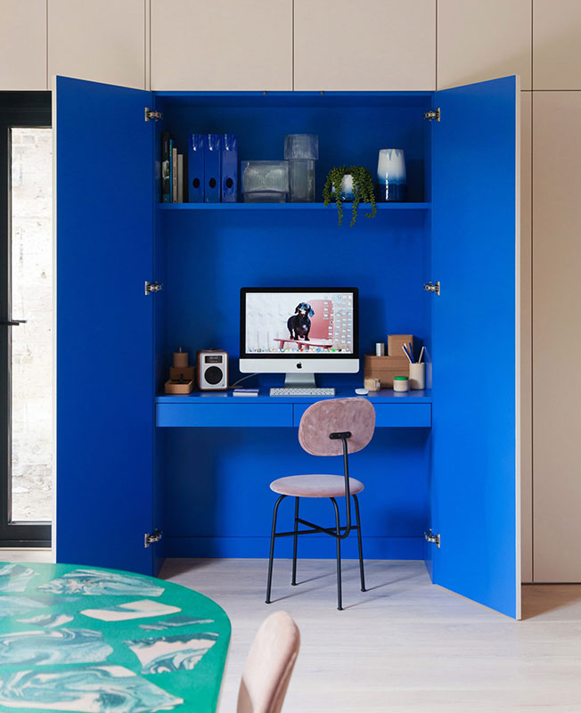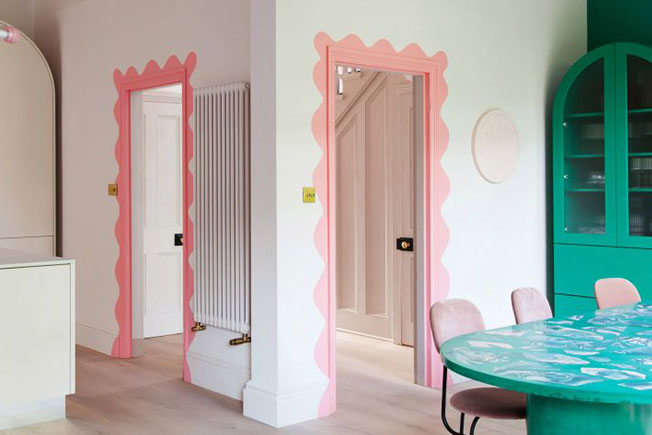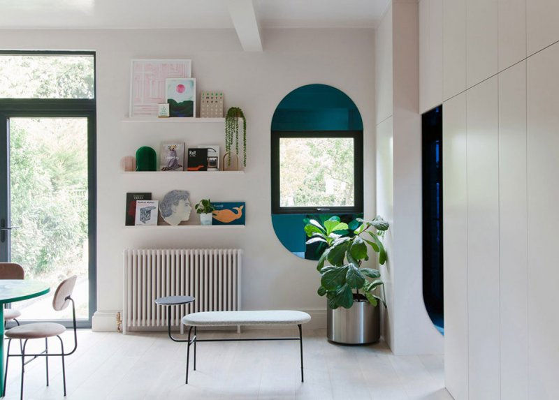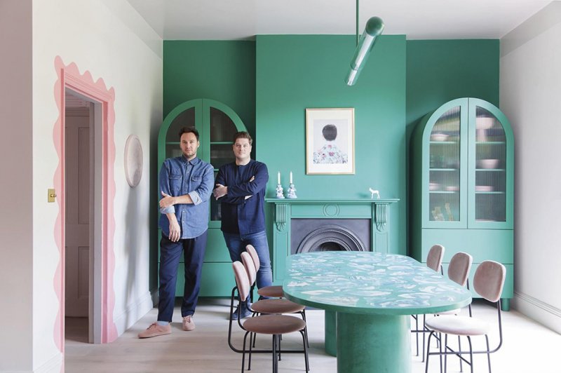 Зоны выделены цветом. В центре парадного пространства находится стол овальной формы с инкрустированной столешницей, который сделали в сотрудничестве с художницей Оливией Аспиналл. Вокруг стоят «румяные» cтулья в бархатной обивке от датского мебельного бренда Menu. «Мы любим нарушать норму», — говорят Рассел и Джордан.