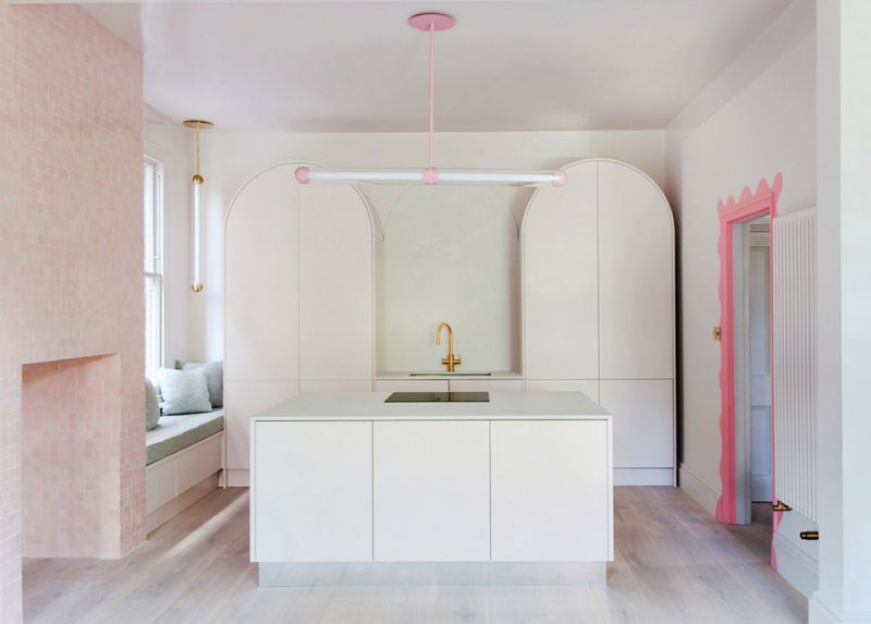 Арки, сводчатые шкафы-витрирны, розово-зеленая палитра, вот лишь некоторые из особенностей, которые 2LG Studio не забыла при капремонте. Когда Уайтхед и Клуро приобрели недвижимость в 2015 году, она была почти полностью разрушена — гнилые оконные рамы, отверстия в потолке и никакого центрального отопления. Мрачная кухня была самой маленькой комнатой в доме со сломанной мебелью 1950-х.