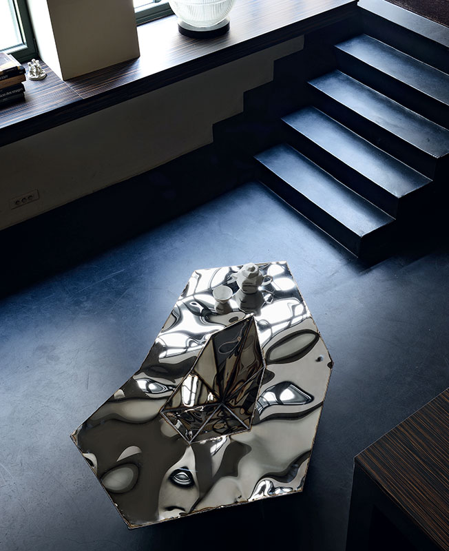 Стол Lunar, диз. Джулиан Мэйор. Полированная до зеркального блеска сталь.