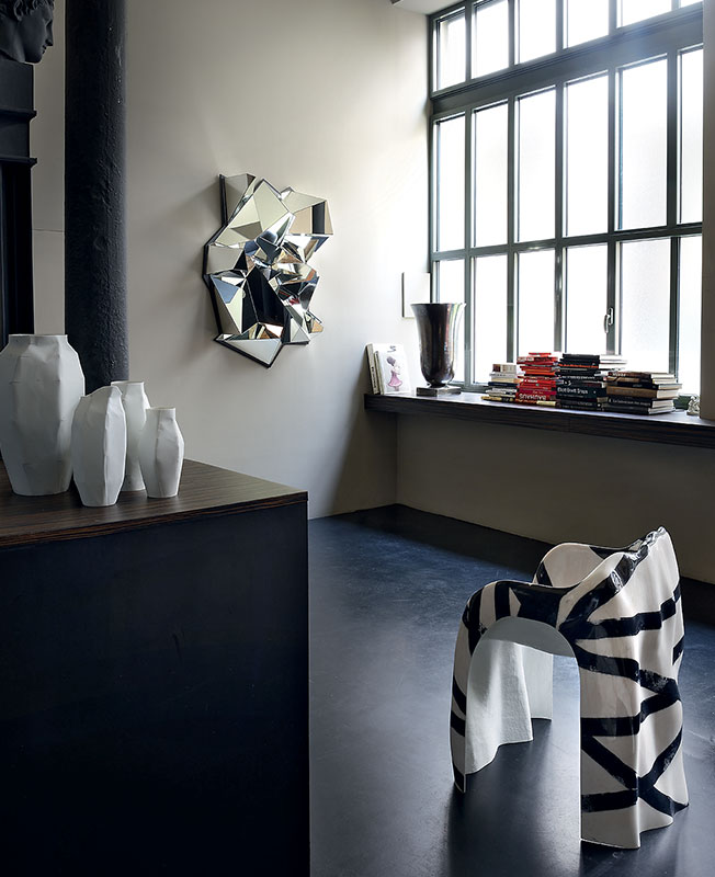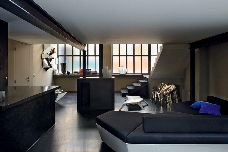 Армель Сойе создала уникальное пространство. Весь интерьер построен исключительно на авторских предметах из коллекции Galerie Armel Soyer. Армель Сойе открыла парижскую галерею недалеко от Центра Помпиду в 2012 году и довольно быстро заняла устойчивые позиции среди продавцов современного коллекционного дизайна. Армель ставила цели и не отступала ни на шаг от намеченных планов. Сама она — смесь перфекционизма и элегантности. Несмотря на скепсис друзей, она купила помещение старой литейной мастерской. И обрела, наконец, свое парижское убежище. Стол Lunar, диз. Джулиан Мэйор. Полированная до зеркального блеска сталь. Черный бетонный пол. Диван Igloo, диз. Матиас Кисс. Мраморные столики, диз. Ифенаи Оганву. Froisse Mirror