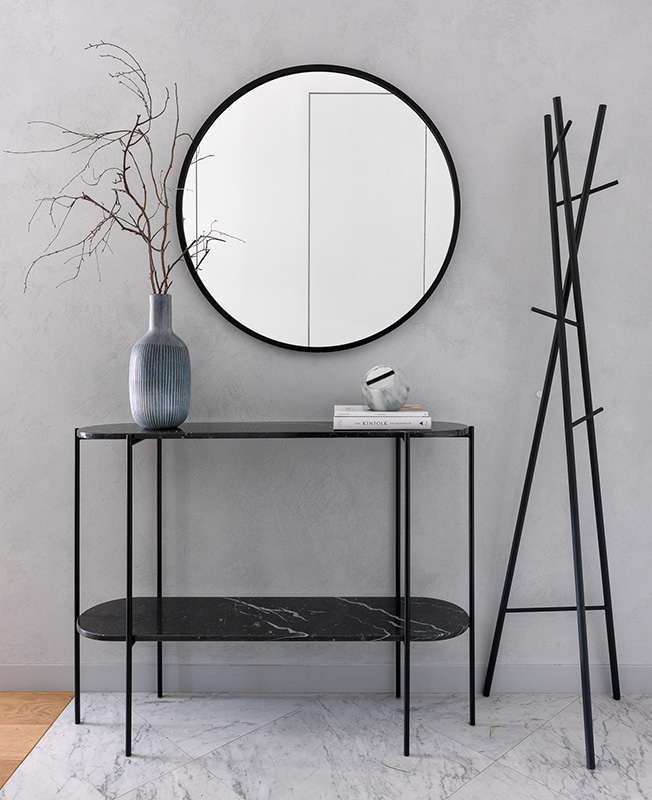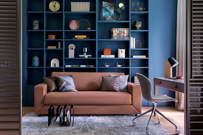Письменный стол The Idea. Лампа, стул рабочий BoСoncept. Ковер Dovlet House. Аксессуары и декоративные подушки на диване BoConcept и Moon Store.
