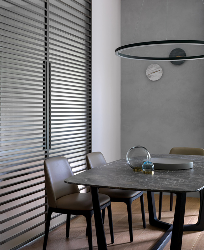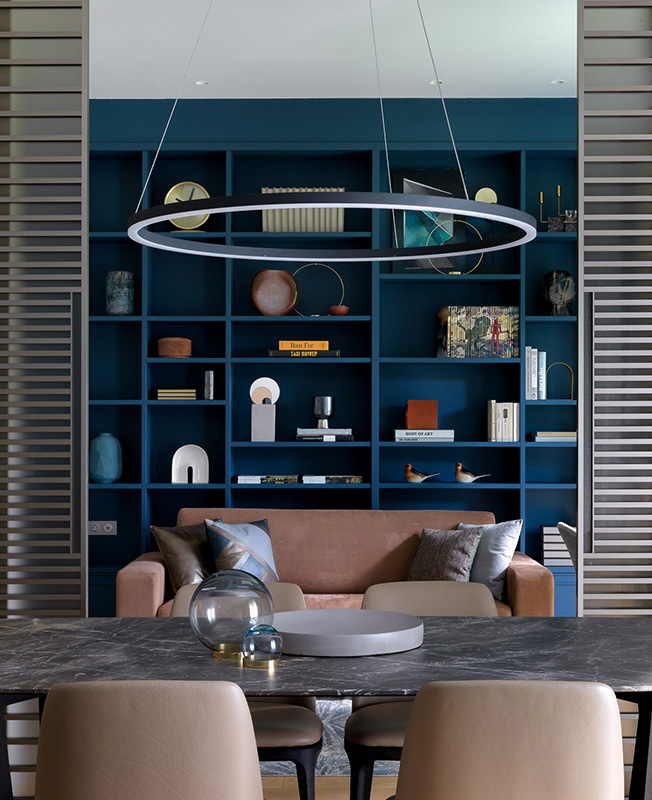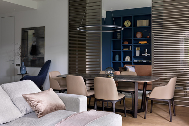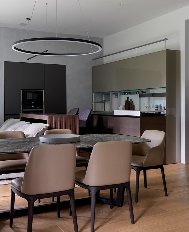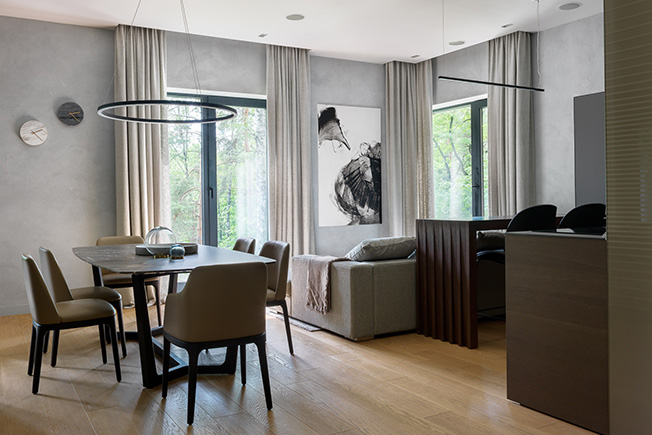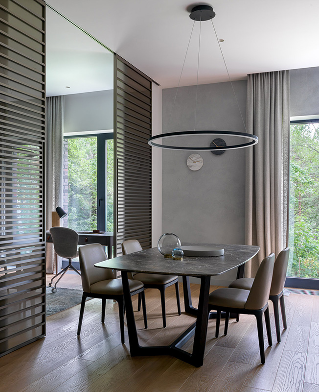 Обеденный стол и стулья Poliform. Люстра Centrsvet. Раздвижные двери Adielle. Текстиль KRASSKY. Вазы на обеденном столе L’appartement. Письменный стол The Idea. Лампа, стул рабочий BoСoncept. Ковер Dovlet House.