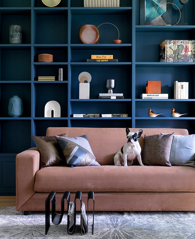 Стеллажи сделаны на заказ по чертежам дизайнеров (компания Wood&Interiors). Письменный стол The Idea. Лампа, стул рабочий BoСoncept. Ковер Dovlet House. Газетница L’appartement. Аксессуары и декоративные подушки на диване BoConcept и Moon Store. Картина Булата Баишева из галереи Art Brut Moscow.