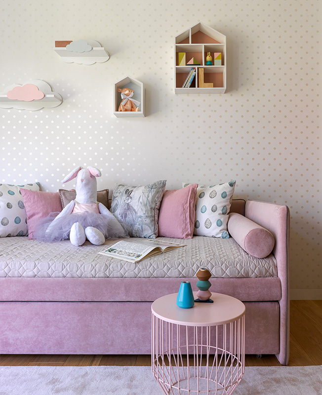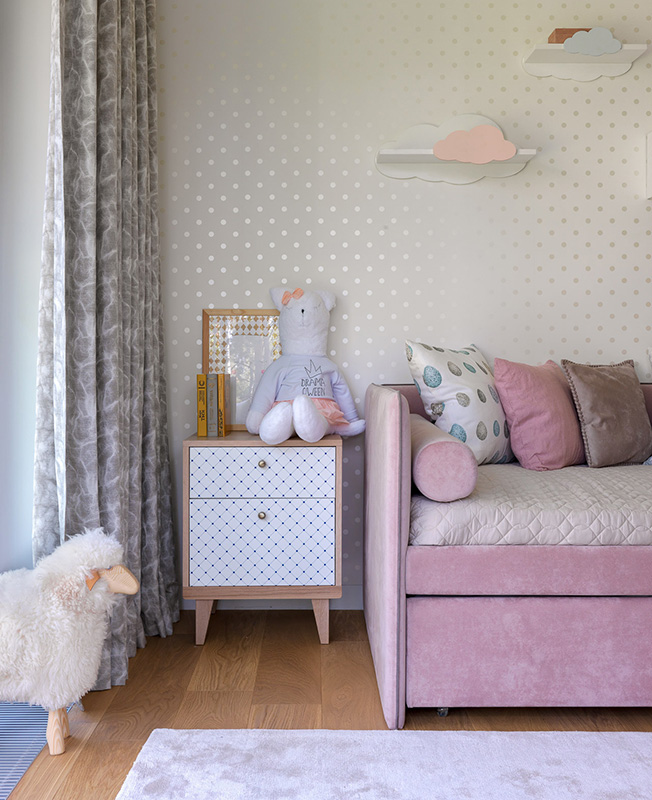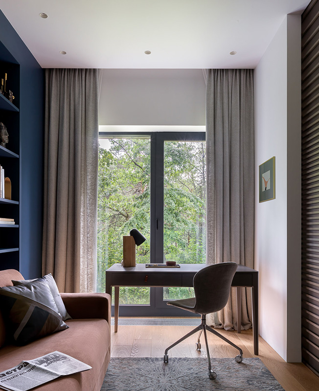 Главное достоинство этой квартиры — вид на лес. Поэтому мы сохранили обзор сразу от входа, так как входная зона не отделена никакими перегородками от гостиной и сразу задает тон всему помещению, сохраняя ощущение свободы, пространства и не перегораживая обзор. В детской угловое огромное панорамное окно открывает вид на лужайку с ландышами и дает невероятное количество солнца. Спальне, наоборот, отдано пространство с окном, куда попадает меньше всего света в квартире, чтобы ничего не мешало отдыхать и набираться сил.