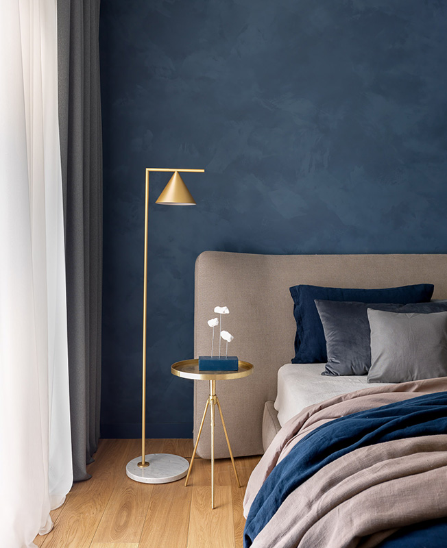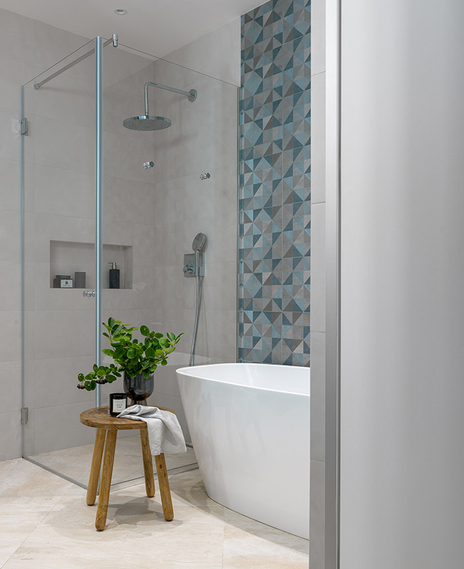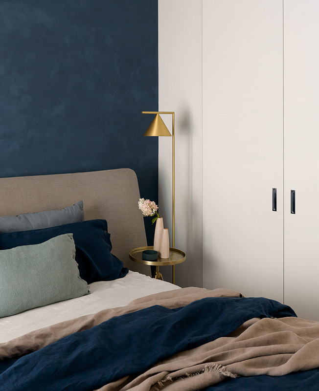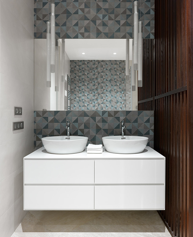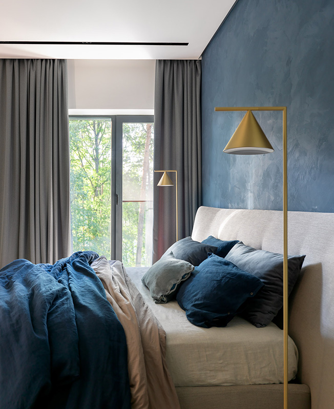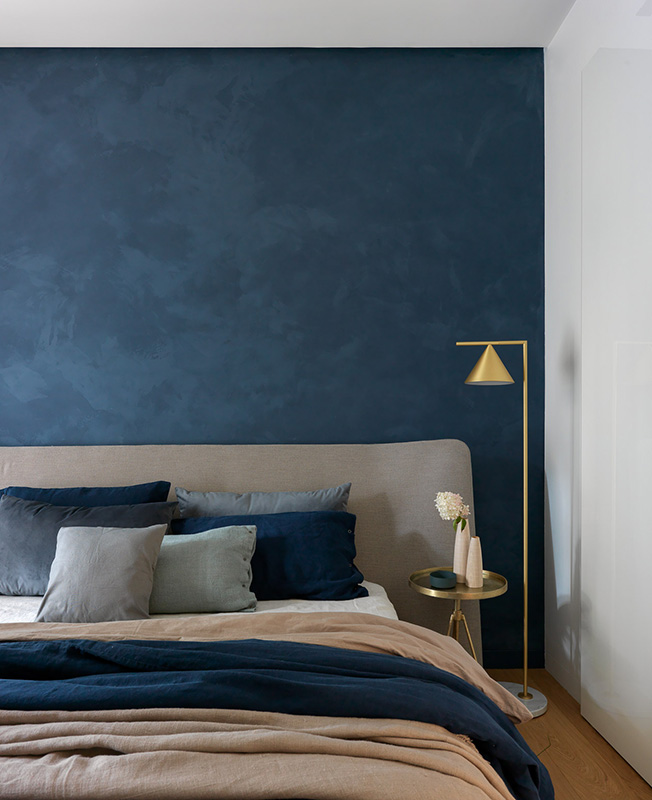 Заказчица очень любит сочетание серого с синим и пыльным розовым. Некая нордическая холодность должна была присутствовать и в интерьере. Благодаря смелости клиентки и ее любви к синему цвету мы сразу согласовали синюю штукатурку в зоне спальни и невероятную плитку Mews от компании Mutina, в которой собраны различные оттенки синего цвета».