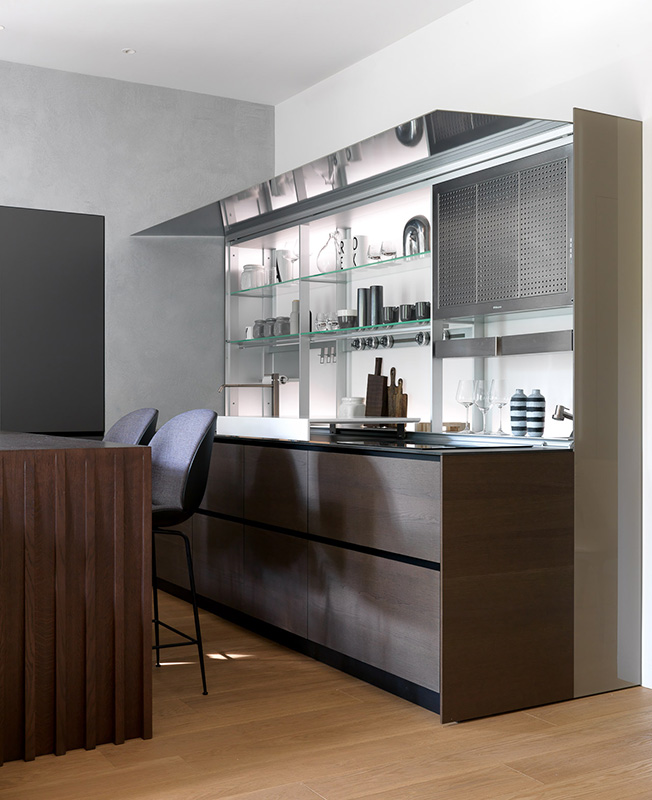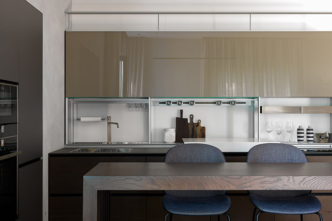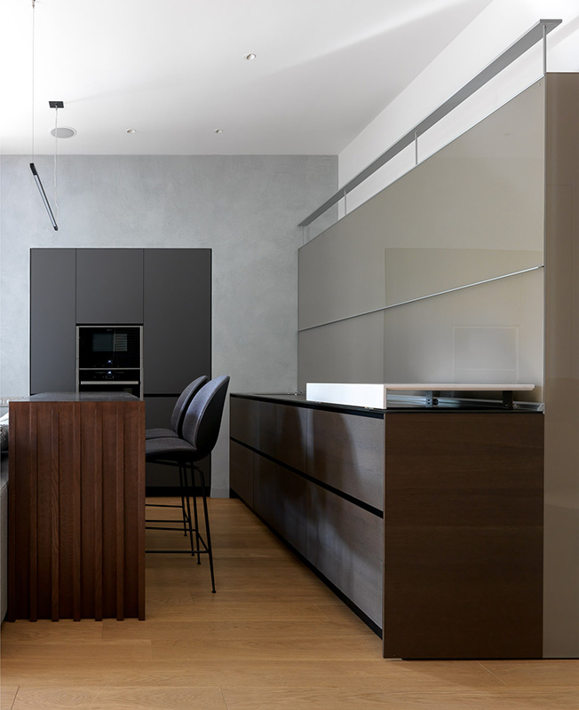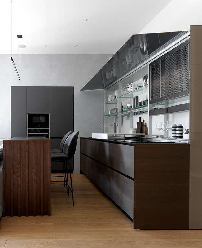 «После трех месяцев просчетов мы создали такую конфигурацию, которая позволила поставить кухню Valcucine, о которой мечтала заказчица. Модель New Logica отличается увеличенной глубиной — почти 100 см вместо стандартных 60 см. Но зато позволяет эргономично и максимально удобно организовать рабочее пространство и скрыть все кухонное оборудование: мойку, кран, электрические розетки, малую бытовую технику и вытяжку.