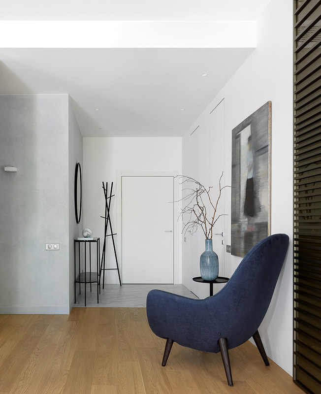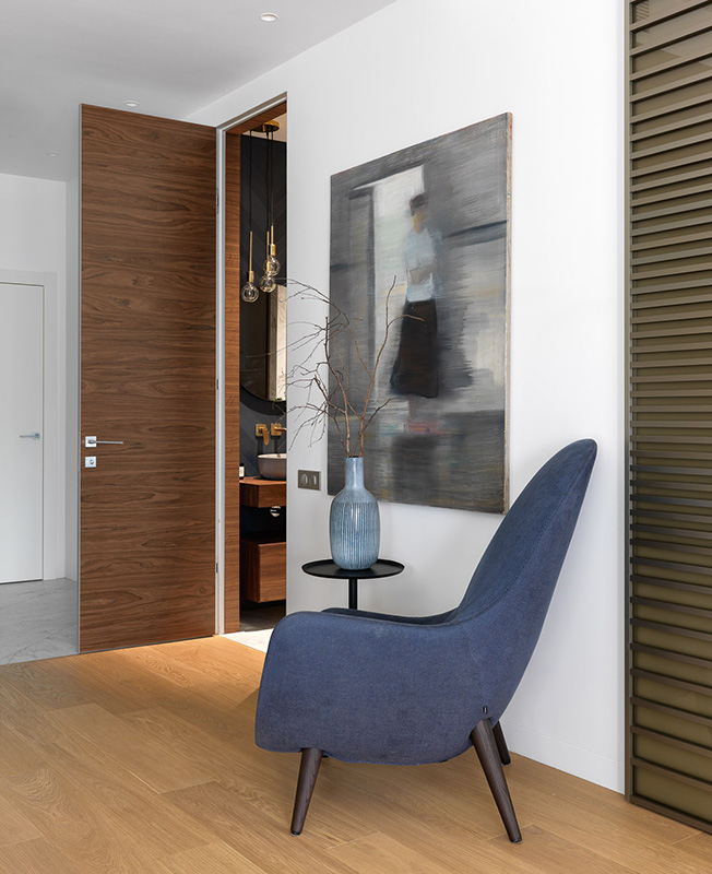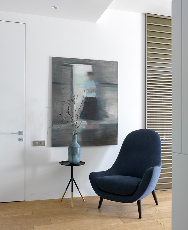 Кресло Poliform. Столик Danish Store. Картина Ольги Красуцкой, галерея Art Brut Moscow. Ваза Moon Stores. Стеновые панели сделаны на заказ по чертежам дизайнеров (компания Wood&Interiors).