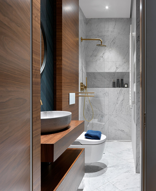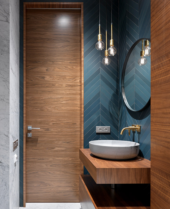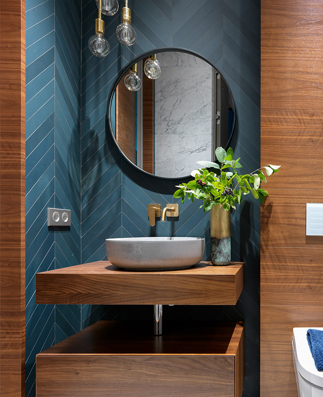 Столешница под раковиной, тумба внизу и стеновые панели из ореха сделаны на заказ по чертежам дизайнеров (компания Wood&Interiors). Раковина Bet-on. Латунные смесители Axor. Ваза и зеркало BoConcept. Синяя плитка Muttina. Керамогранит Carrara (COEM).