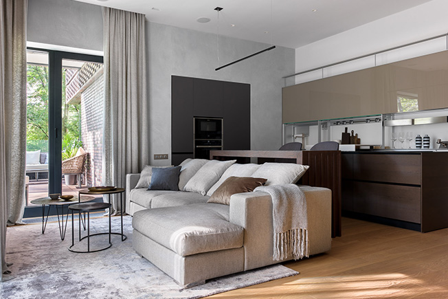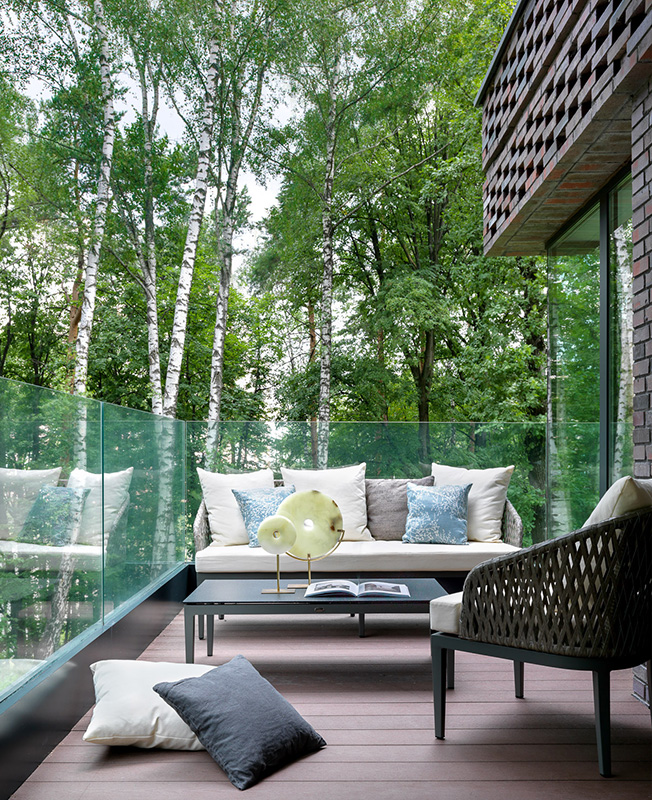 Дом, в котором находится квартира, расположен немного отдаленно от остальных домов. Квартира на первом этаже, двумя сторонами развернута в сторону леса и реки, поэтому вид из любой точки внутри помещения завораживает. Особенно это чувствуется, когда выходишь на террасу. Это главная точка всей квартиры — просторная, со стеклянным ограждением, немного поднятая над уровнем земли, с открывающимся видом на лес и реку. Она притягивает устроиться с бокалом вина на уютном диване под тенью деревьев и погрузиться в волшебную атмосферу этого места».