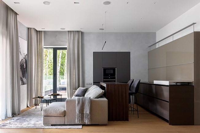 Обеденный стол и стулья Poliform. Люстра Centrsvet. Раздвижные двери Adielle. Текстиль KRASSKY. Вазы на обеденном столе L’appartement. Ксения Коровина и Катерина Закурдаева, бюро Design Filosofia, оформили интерьер квартиры площадью 120 кв. метров в ЖК «Рублево Парк». Ее несомненное достоинство — просторная терраса с живописными видами. «Квартира сразу нас поразила! — рассказывают дизайнеры. — Мы уже делали до этого объект в ЖК «Рублево Парк», но в другом доме, и знали все достоинства данного комплекса — вековые сосны на территории, развитая инфраструктура, ощущение загородного отдыха и отличная транспортная доступность. Но такого мы не ожидали. Мраморная консоль Create Marble. Вешалка BoConcept. Зеркало Designboom. Ваза Moon Stores. Диван BoConcept. Журнальные столики Dantone Home. Текстиль KRASSKY. Ковер Dovlet House. Картина Софьи Пятницкой, галерея Art Brut Moscow. nonenonehttps://www.facebook.com/designfilosofia/https://www.designfilosofia.com Дом, в котором находится квартира, расположен немного отдаленно от остальных домов. Квартира на первом этаже, двумя сторонами развернута в сторону леса и реки, поэтому вид из любой точки внутри помещения завораживает. Особенно это чувствуется, когда выходишь на террасу. Это главная точка всей квартиры — просторная, со стеклянным ограждением, немного поднятая над уровнем земли, с открывающимся видом на лес и реку. Она притягивает устроиться с бокалом вина на уютном диване под тенью деревьев и погрузиться в волшебную атмосферу этого места». Диван BoConcept. Журнальные столики Dantone Home. Кухня Valcucine. Барная стойка сделана на заказ по чертежам дизайнеров (компания Wood