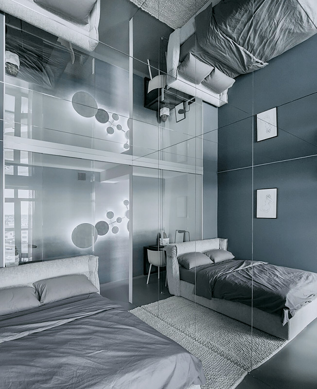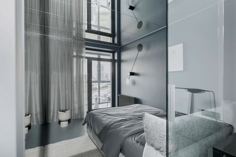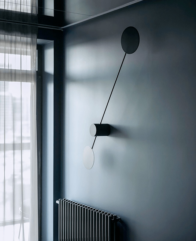 Екатерина Рулинская и Алексей Кораблев, архитектурное бюро Zrobym architects, представили проект квартиры в серых тонах в Минске. Он носит название Midnight Flat. Квартира площадью 60 кв. метров предназначена для временного пребывания: хозяин жилья из Италии, останавливается здесь время от времени. Отсюда полное отсутствие шкафов и небольшая кухня с системой поворотно-сдвижных фасадов. Почти вся техника скрыта за рельефной створкой: когда она закрыта, на виду остается лишь кухонный остров с барной стойкой, который становится частью гостиной. «По просьбе хозяина мы старались максимально избегать ярких тонов и не выходить за рамки монохромной гаммы, — говорят архитекторы. — Другим его пожеланием было использование только локального и направленного освещения. В итоге, каждая зона приобрела свою атмосферу». В интерьер ненавязчиво вплели тему космоса: его глубины символизирует градиентная стена с переходом от глубокого синего к серому. Округлые светильники напоминают планеты. Модель Alpha and Omega в гостиной была разработана специально для этого проекта: за счет подсветки разные по диаметру круги будто парят в воздухе на расстоянии от стены.