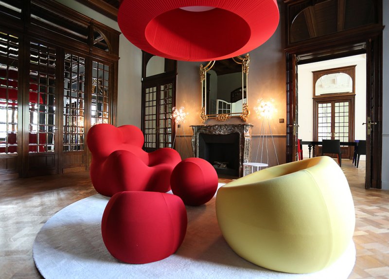 Одна из трех гостиных взяла на себя функции приемной, библиотеки и музыкального салона. Кресла Lazy '05 дизайна Патрисии Уркиолы. Потолочный светильник AxoLight.