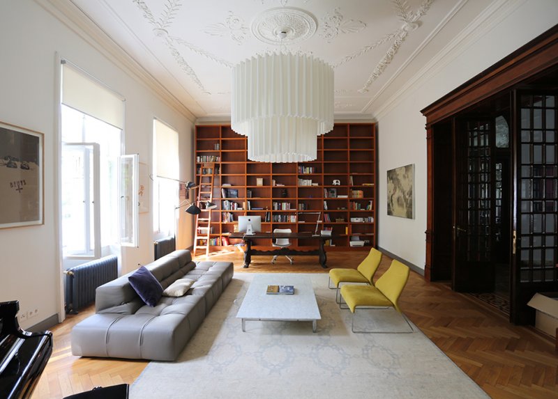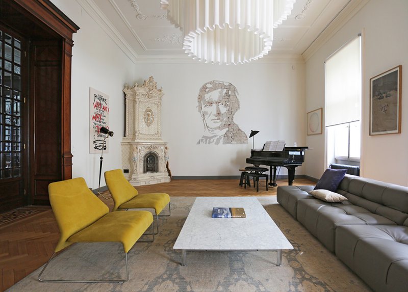 Одна из трех гостиных взяла на себя функции приемной, библиотеки и музыкального салона. В простенке за диваном работа Йозефа Бойса. Мебель B&B Italia: кресла Lazy '05 дизайна Патрисии Уркиолы и диван Tufty-Time того же автора. По словам Уркиолы, в этой модели она хотела возродить классический диван честерфилд, но в интерпретации 60-х и 70-х годов, стиль которых очень ценит. Потолочный светильник AxoLight.