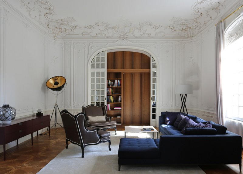 Большие пространства, роскошная анфилада, великолепная лепнина, уникальный, хотя и требующий реставрации, паркет — потрясающий потенциал, который был очевиден для нас, когда мы впервые вошли в дом. Концепция интерьера предполагала сочетание современной обстановки и исторического декора, в значительной степени сохранившегося в первозданном виде.