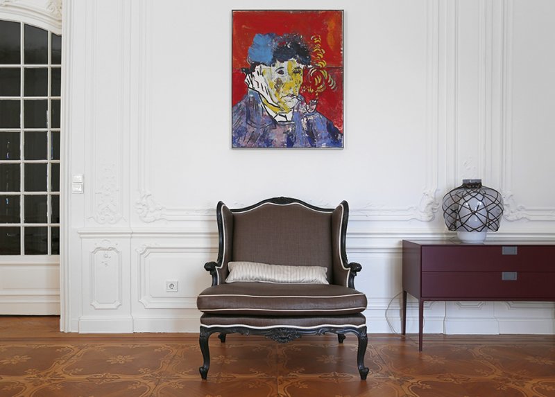Портрет Ван Гога — работа музейного уровня. Автор — австрийский художник Отто Мюль (1925-2013), один из основателей Венского акционизма. Кресло Chelini, консоль B&B Italia.