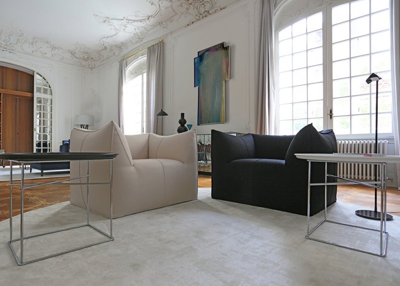 Cемейная гостиная. На стене работа Арнульфа Райнера. Кресла-«подушки» — ремейки легендарной модели Марио Беллини 1970-х, B&B Italia. Cтолики того же бренда, дизайн Патрисии Уркиолы.