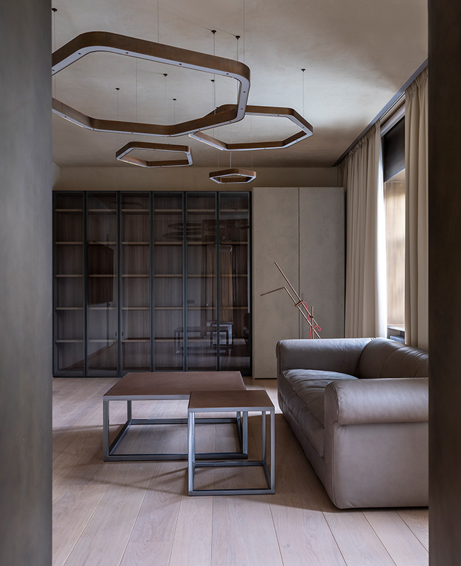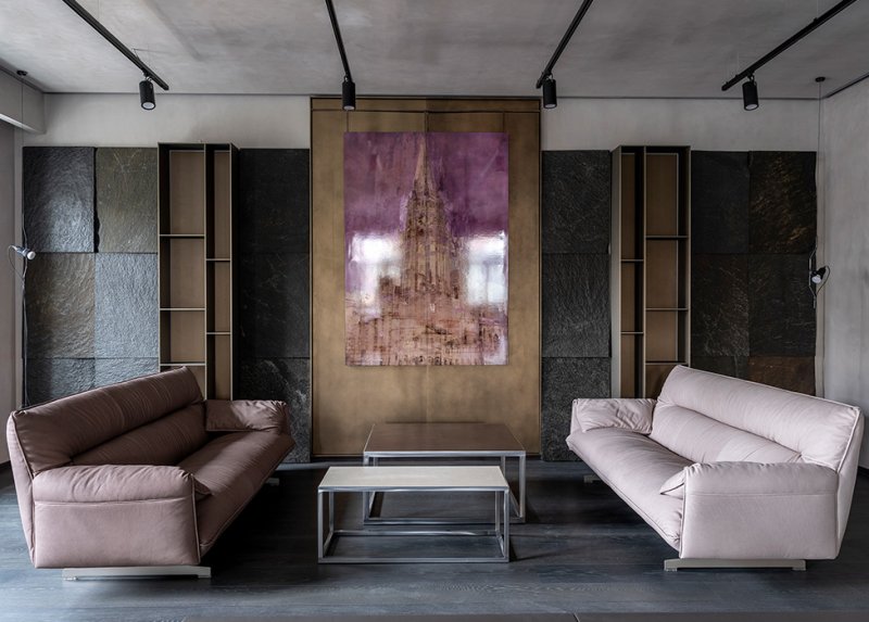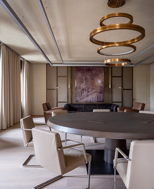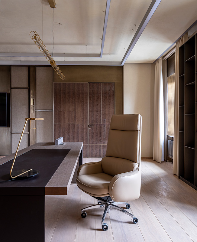 Для декорирования стен в кабинете второго этажа были заказаны крупноформатные слэбы из сланца толщиной от 3 до 10 см. На третьем этаже отдали предпочтение текстильным панелям. Объединяющим материалом в обоих кабинетных блоках выступают латунь и двери фабрики Longhi.