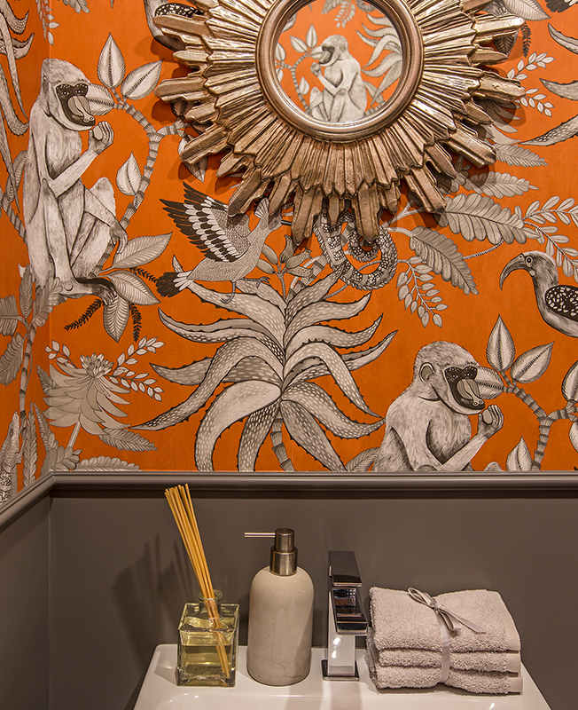 Чтобы сделать интерьер выразительным и оригинальным не в ущерб функциональности, Дарья сосредоточилась на отделочных материалах, фактурах и цветах. «Стены и плинтус требовали обязательной перекраски, для этого я выбрала английскую краску Little Greene с глубоким матовым эффектом. В гостевом санузле английские обои с мартышками Cole & Son создают моментальное ощущение радости и добавляют легкой иронии. Чтобы добиться глубины цвета пола, американский орех дополнительно обработали несколькими слоями масла.
