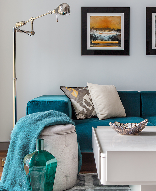 Диван Kartell, диз. Пьеро Лиссони. Журнальный стол изготовлен по эскизам дизайнера. Торшер Ralph Lauren. Гардины изготовлены на заказ. Подушки, плед, вазы – Happy Collections. Картины над диваном — работы французского абстракциониста Кристиана Эвана, галерея Carredartiste.