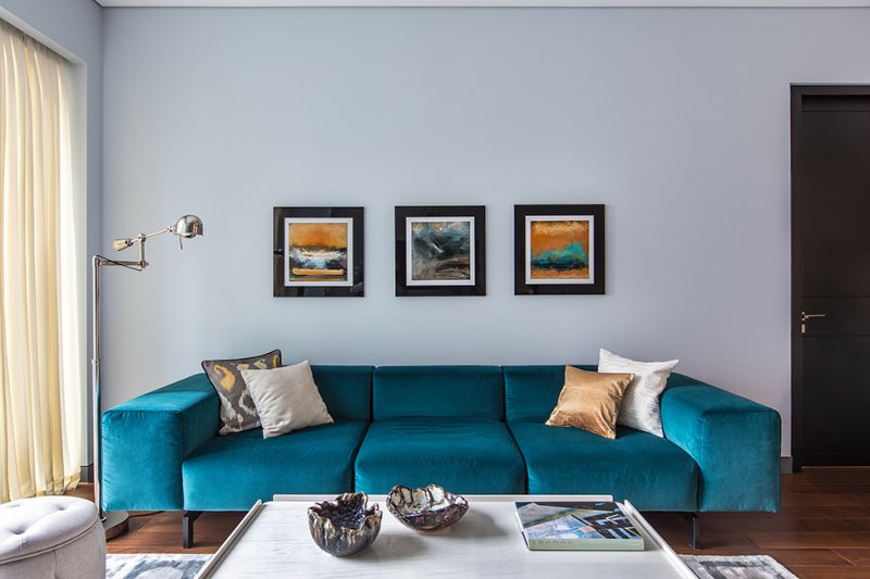Войдя впервые в пространство будущей спальни, я сразу обратила внимание на то, как солнце отражается в башне Меркурий золотисто-оранжевыми переливами. Тут и началась моя история цвета, мне захотелось внести эти краски в наш интерьер. Заказчица меня сразу же поддержала. Так в спальне получился образ теплого песчаного пляжа на закате с бежево-золотистыми оттенками и ярким, но органичным оранжевым акцентом на шторах. А в гостиной — прохлада морского бриза.