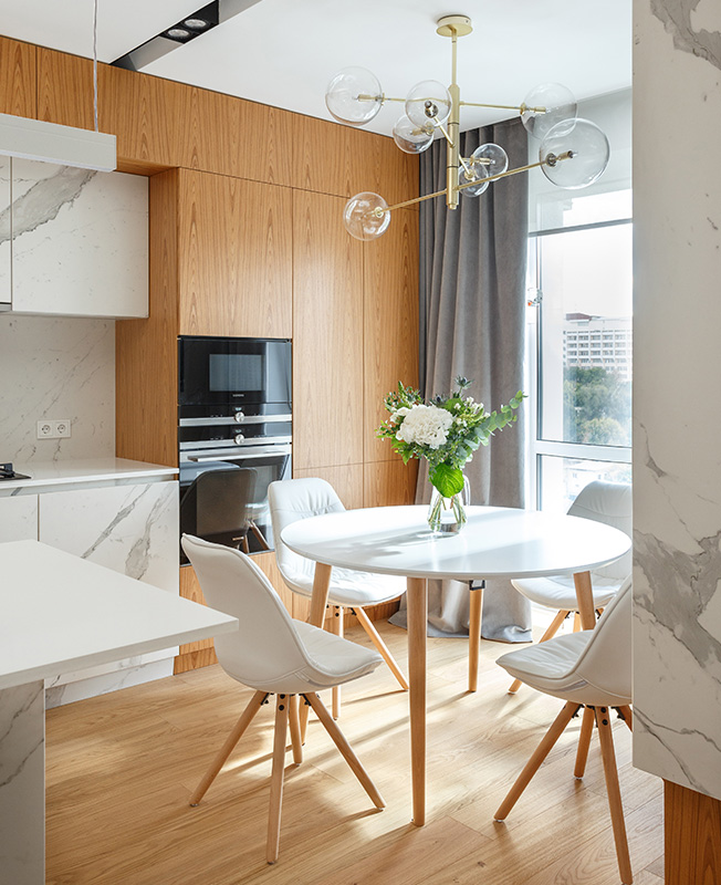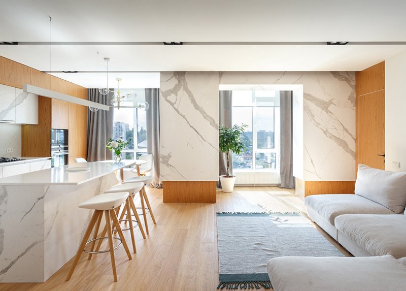 Кухня, столовая и гостиная образуют опен спейс. Дерево плюс камень — беспроигрышное сочетание материалов. В присоединенном балконе хорошо себя чувствуют комнатные растения. Корпусная мебель изготовлена на заказ.