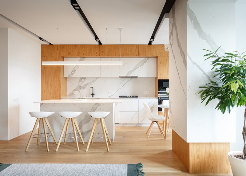 Основные материалы интерьера — ламинам с фактурой камня и дерево. Кухня изготовлена на заказ. Стулья Calligaris. Кухонное оборудование Siemens, Franke. Свет SLV.