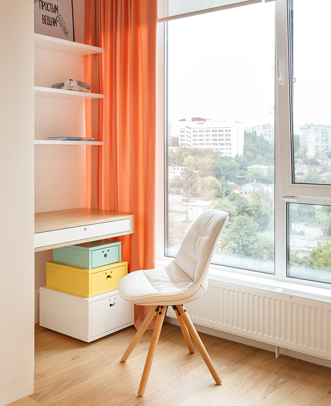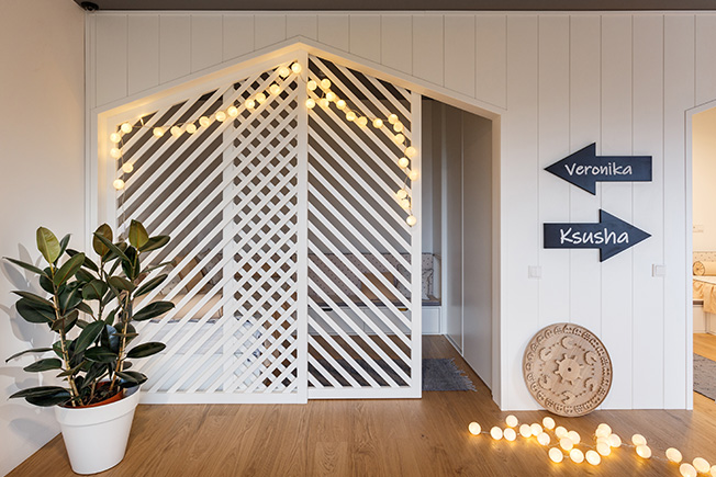 Чтобы увеличить детскую, площадь позаимствовали у гостиной. Просторная комната для двух детей органично зонирована: есть игровая и учебная зоны, где девочки проводят время вместе, а также индивидуальные компактные спальни — они решены как мини-домики и разделены простенком с гардеробом. В системе хранения имеется «потайной тоннель»: по нему девочки ходят друг к другу в гости.