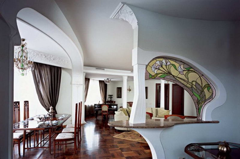 Содержание обзора: История стиля модерн Характеристика стиля модерн в интерьере Модерн и современность Модерн — Особенности стиля История стиля модерн Распространение стиля модерн в Европе началось в конце девятнадцатого века. В это же время он появился и в России. Наибольшей популярностью стиль стал пользоваться в аристократических кругах Москвы и Петербурга. В салонах аристократов в то время царила атмосфера символизма и декадентства. Этот период получил название Серебряного века. Желание достичь гармонии и изящества во всем отразилось и на интерьере помещений. Дизайн интерьера в стиле модерн На смену классическому стилю с его прямыми линиями пришел стиль с плавными и мягкими изгибами. Французы назвали его Ар-Нуво. Во всех странах его называют по-разному. Стиль модерн прослеживался не только в интерьере помещений. Популярность его была настолько велика, что начали проявляться дома в стиле модерн, картины, ювелирные изделия и даже в одежда. Стиль модерн в интерьере Характеристика стиля модерн в интерьере Плавность и изящество линий характерно для этого стиля. Прослеживается изогнутая линия во всех деталях интерьера. Окна, двери, мебель изготовлялись с чувством стиля и утонченности. Материалы для изготовления мебели и предметов декора только натуральные. Дерево светлых тонов в основном служило для производства мебели. Изделия, выполненные из кованого железа, были воздушны и легки. Первооткрывателем изготовления кованых изделий был Гауди. Он явился вдохновителем для многих мастеров. Методом художественной ковки были выполнены каминные решетки, элементы лестницы, дверные ручки и многое другое. Было широко распространено применение природного камня для отделки. Как выполнить интерьер в стиле модерн? Витражи – популярные элементы стиля модерн. Они служили украшением окон, дверей, мебели. Всевозможные мотивы с использованием плавных линий были изображены на них. Для стиля модерн характерны рисунки с изображением растений и животных. Многие изображения были символичны. Довольно часто встречалось изображение бутона, который символизировал начало новой жизни. Птицы и насекомые тоже часто появлялись на рисунках. Эти мотивы можно было увидеть на витражах, вазах и на других предметах интерьера. Витражные окна в стиле модерн Цветное стекло было популярно для изготовления элементов декора. Известен своими дизайнерскими работами по стеклу Луис Комфорт Тиффани. Поэтому стиль модерн называется в Америке стилем Тиффани. Характерно для этого стиля и использование мягких натуральных цветов. Очень популярны были оттенки серебристого и золотого цветов. Используются все приближенные к натуральному цвету. Романтическая обстановка достигалась использованием приглушенного света. Поэтому светильники были сделаны из цветного и матового стекла. Витражи в интерьере дома Обязательным условием для создания стиля считалось использование большого пространства. Полы могли быть разного уровня. Часто использовались подиумы. Для изготовления пола применялся фигурный паркет. Узор этого паркета напоминал изгиб морской волны. Потолки украшались гипсовой лепниной. Потолок мог иметь несколько уровней с плавными переходами. Модерн и современность В современном мире стиль модерн снова стал пользоваться популярностью. Так же как и 