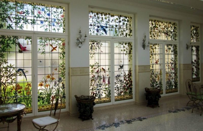 Витражи – популярные элементы стиля модерн. Они служили украшением окон, дверей, мебели. Всевозможные мотивы с использованием плавных линий были изображены на них. Для стиля модерн характерны рисунки с изображением растений и животных. Многие изображения были символичны. Довольно часто встречалось изображение бутона, который символизировал начало новой жизни. Птицы и насекомые тоже часто появлялись на рисунках. Эти мотивы можно было увидеть на витражах, вазах и на других предметах интерьера.