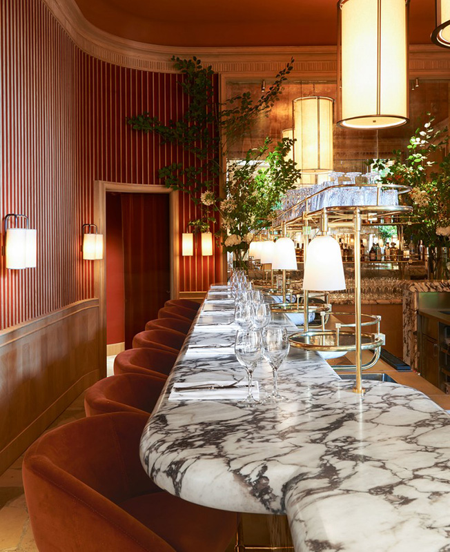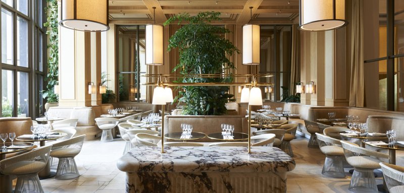 Парижский «Жираф» назван одним из лучших ресторанов 2018 года. Во многом благодаря атмосфере и интерьерам авторства французского архитектора, мастера сдержанного люкса Жозефа Дирана.