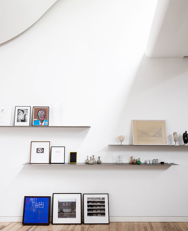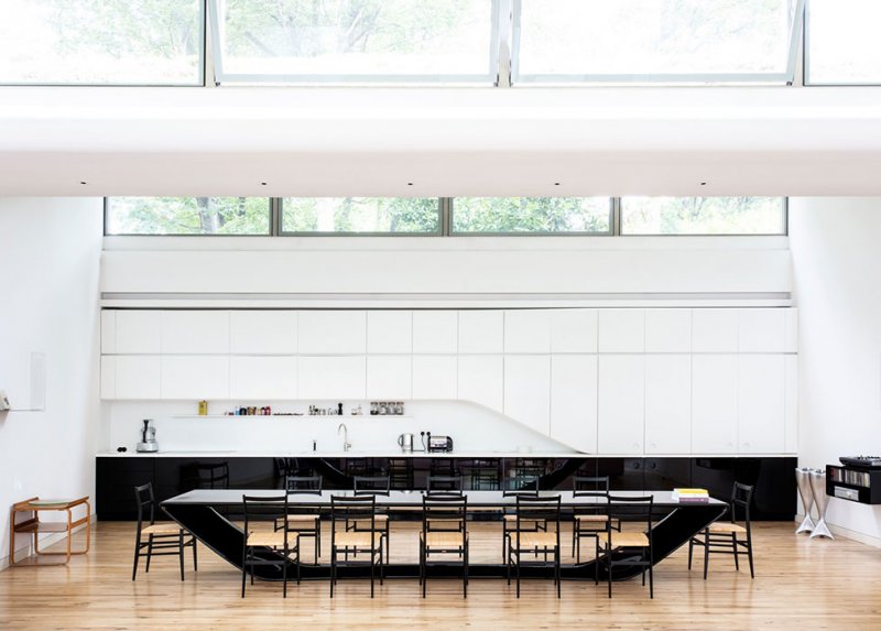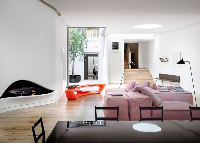 В доме Ливит и Эванса царят овалы и закругленные формы как в структуре, так и декоре. Здесь мало цвета или каких-либо визуально отвлекающих факторов — пространство отличается щедрой высотой потолков и обилием естественного света, излучаемого, в том числе, и через окна в крыше. Стулья Джо Понти, торшеры Сержа Муйя соседствуют с немногими яркими современными предметами — по дизайну Себастьяна Рона и самой Аманды Ливит: например, ее столом Drift, изданным Established & Sons.