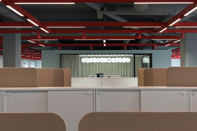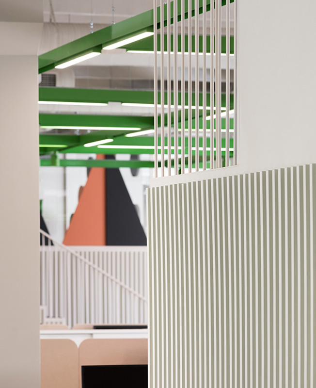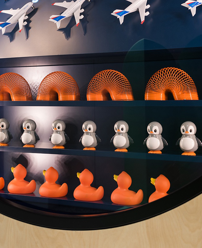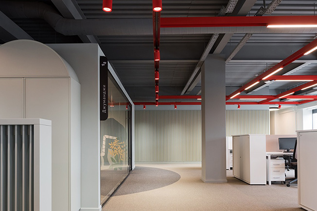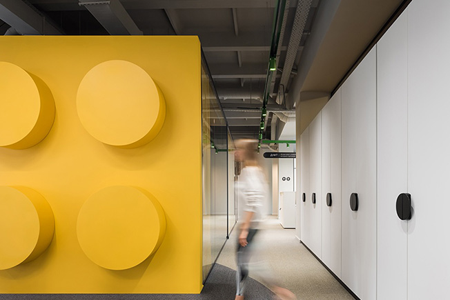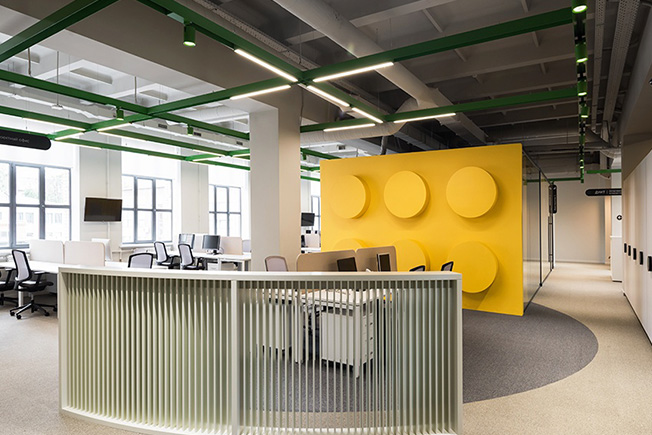 Трансформация рабочего пространства в игровое поле и искажение привычного масштаба — два основных мотива. «В детстве окружающие предметы кажутся больше, чем есть на самом деле, и воспринимаются не как функциональные объекты, но как пространство для игры. Это ощущение стало основой дизайн-решения», — рассказывают авторы.