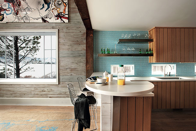 Кухня, примыкающая к столовой, выделена понижением потолка. Барные стулья, диз. Г. Бертойя, для Knoll. Бирюзовую плитку отыскали в Майами.