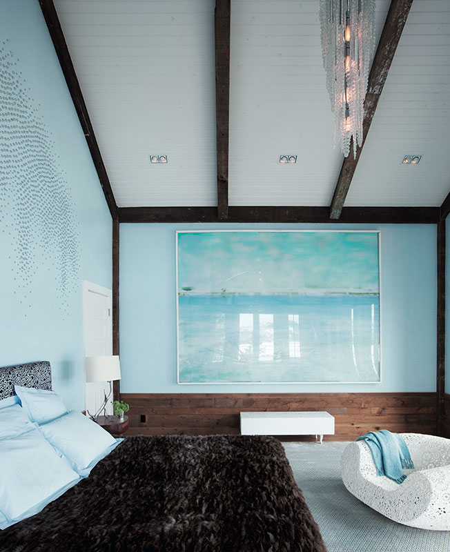 Палитра спальни цвета снега, льда и зимнего неба. В изголовье скульптура из стекла Т. Ферандес. Рядом Make a Duke out of a cow У. Фишера. Кресло Crochet, диз. М. Вандерс. Серебряная лампа: М. Пергей.