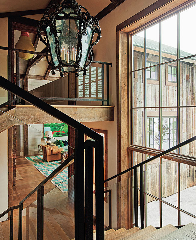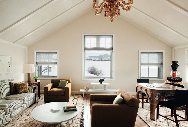 Аспен — городок в штате Колорадо с населением в шесть тысяч и репутацией самого дорогого зимнего курорта США. Если смотреть по карте, он — в самом центре страны. Декоратору Фрэнку де Биаси достался здесь интересный проект. Слово автору: «Дом площадью 1500 кв. м построило бюро Skidmore, Owings and Merrill в семидесятых годах. Выглядит он как череда коттеджей, такой мини-поселок, который карабкается по склону холма. Очень удачная, ясная архитектура, с чувством места, великолепно вписанная в ландшафт. А обшивка из винтажных досок на фасаде роднит постройку со старыми ранчо в Колорадо.