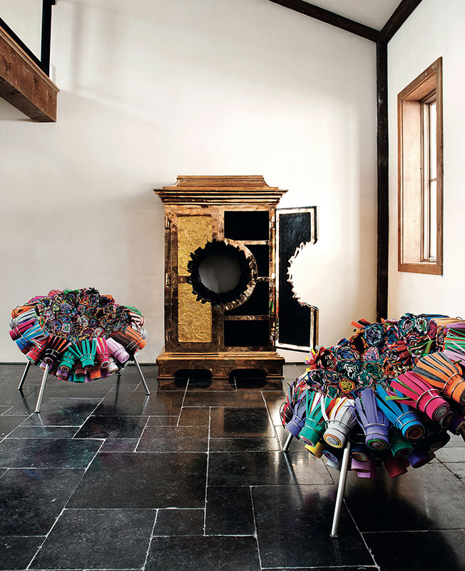 Бронзовый шкаф с отверстием, будто пробитым пушечным ядром, вдохновлен образцом XVII в. из мастерской А.-Ш. Булля (диз. Studio Job). Кресла Sushi IV, диз. Ф. и У. Кампана. На полу — винтажные каменные плиты.