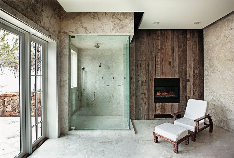 Хозяйская ванная. Серо-бежевый мрамор, старое дерево. Стена вокруг камина включает скрытую систему хранения. Французский шезлонг. 1930-е гг.