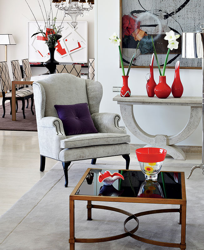 В данном случае заказчики пригласили его оформить дом в окрестностях Мадрида. Они переехали за город, потому что «мечтали хорошо высыпаться по ночам». Большой сад, бассейн — дополнительные радости, которых лишены жители мегаполиса. Относительно интерьера у них было единственное пожелание: чтобы его выполнил Хавьер Кастилья; у семьи уже был удачный опыт совместной работы с талантливым автором. На этот раз мастер тоже не подвел: создал дом, где сочетается парадная обстановка и тепло семейного очага, респектабельность и модный шик. Основа — классика сороковых, любимая стилистика Хавьера, которая удается ему особенно блестяще.