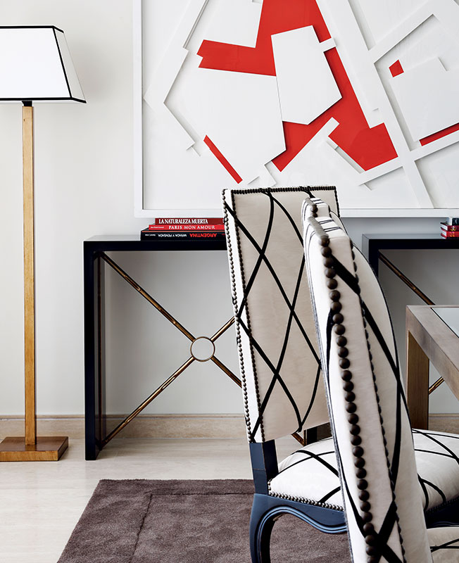 Вид из гостиной на столовую. На стене — работа Э. Келли «the 8». На мраморной консоли эпохи ар деко эффектно выставлены красные стеклянные вазы, ковер, диз. Х. Кастилья.