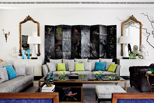Гостиная. Старинные зеркала расположены справа и слева от китайской ширмы XIX в. Бронзовый канделябр Anmoder. Диваны в льняных обивках. Стол сер. ХХ в.